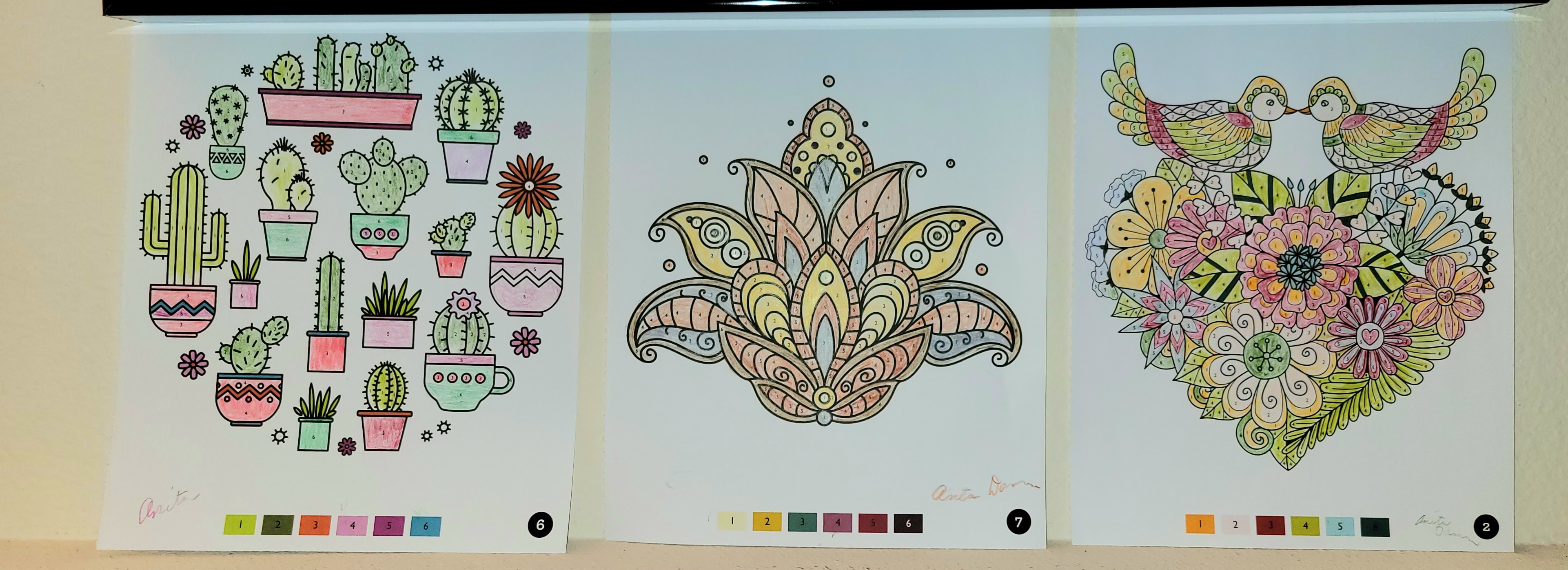 Mom had been working on coloring a picture of lovebirds. She thought it was a fitting way to commemorate her and my dad’s wedding anniversary. She finished the picture today and we displayed it with the couple of others she has done. They are color by number and she matches the colors recommended on the page. She really enjoys the activity. They turn out lovely, even though she says she makes mistakes. I assured her there are no “mistakes” in art. Just beauty.