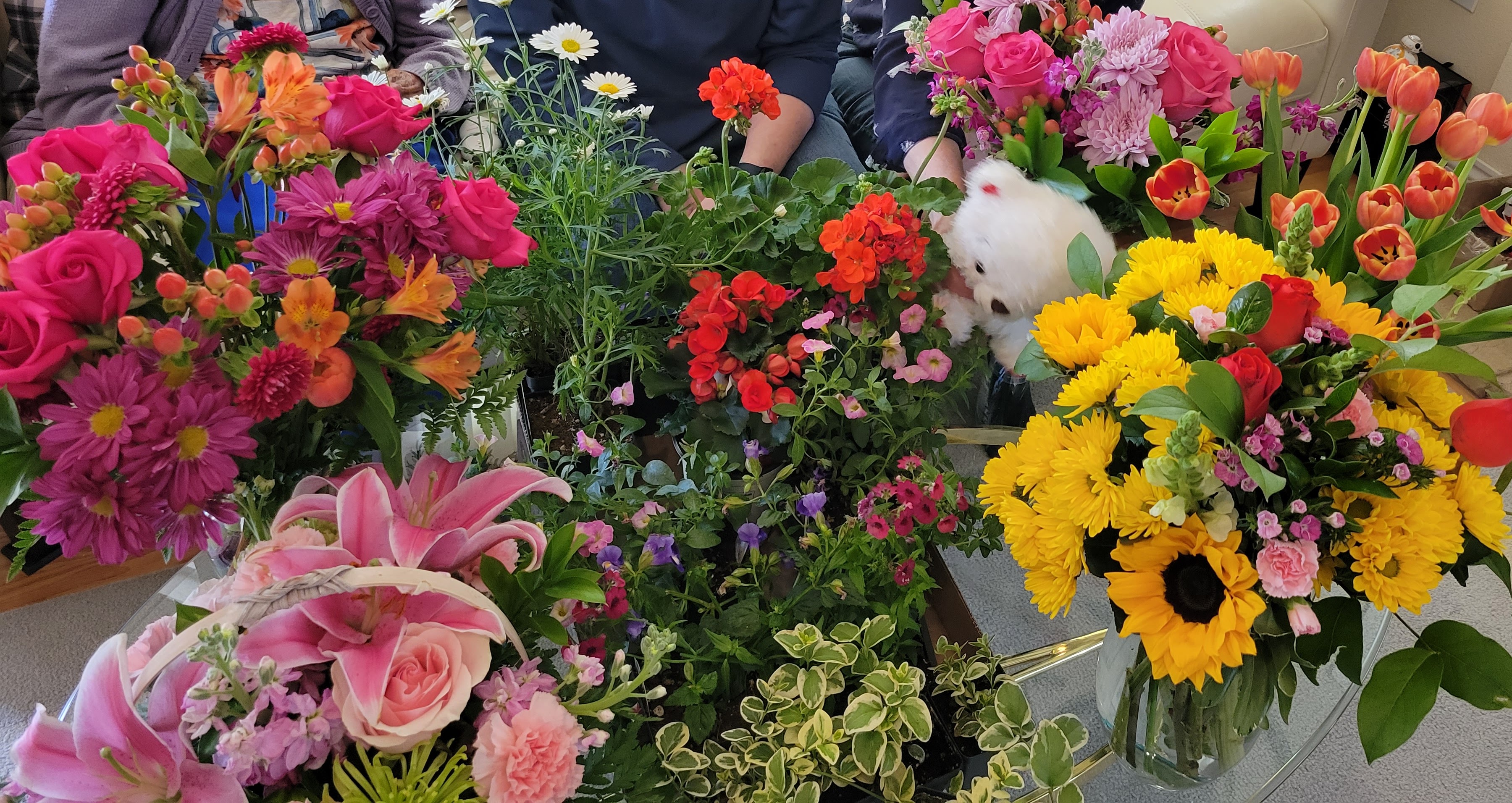 The flowers started arriving yesterday. This morning, my sister came and brought more flowers. They were and will be such a joy especially for my mom. My sister also brought food and we had a lovely girls brunch. After that I went to Mass. The deacon gave a great homily. He told a story of when one of his kids was in college and had finished the semester. He was to spend a year abroad. The deacon’s wife went to help the young man pack. He was instructed to make 3 piles – 1 with things he would take with him, 1 with things that would be sent home, and 1 of the things that would go into storage. When the mother arrived, the deacon joked that there were 3 piles, 1 of dirty laundry, 1 of clean laundry, and 1 of questionable laundry. The mom asked why he didn’t do what he was asked. He said it was the end of the semester and had to get together with friends, and besides, he knew his mom was coming to help. Of course, the mother did get everything organized and helped to pack up everything. When they went to the storage unit, they found it to be not much more than a tin shed. So, they went and purchased some cellophane and wrapped everything up before they left it for a year. The deacon compared the mother’s actions to that of the Holy Spirit. Just like the loving mother, the Holy Spirit can come into our lives and help us make sense of the piles of stuff we have. It can protect us and make sure we are all taken care of. Just like the young man counted on his mom, we can trust that the Holy Spirit will be there for us. I loved the analogy. After Mass, I spent some time with my son and had lunch and a movie. It was a great day. Mom did very well overall today, which was the biggest blessing of all.