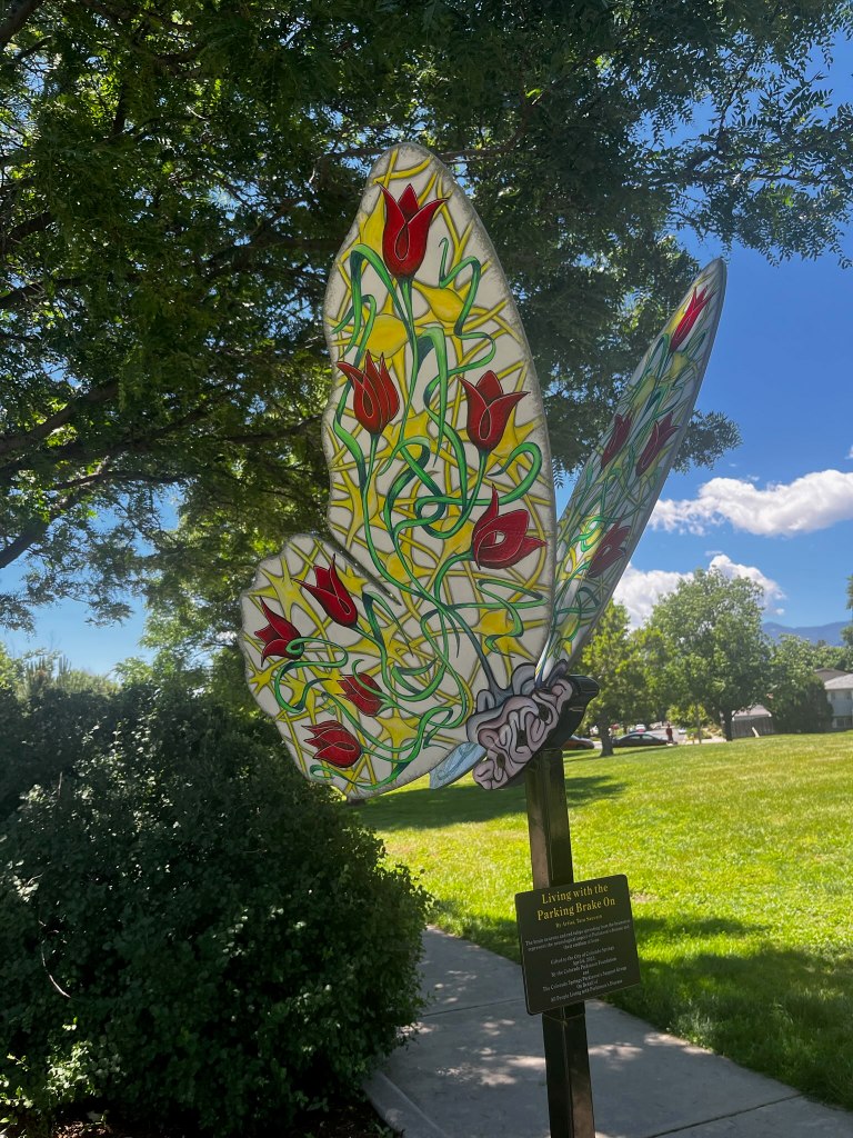 At breakfast we asked my mom what she wanted to do on this beautiful day. She said she wanted to go to the park and see the Parkinson’s Butterfly. Last year, the daughter of a man with Parkinson’s disease created a butterfly piece of art that was auctioned off at the Rotary Club’s annual fundraiser. The local Parkinson’s Support Group won the bid and purchased the sculpture. Then they donated it to the city. This year in April – which is Parkinson’s awareness month – the butterfly was placed at a local park. We learned about it through the Parkinson’s Support Group and mom has been wanting to see it. My sister, brother, mom, and I traveled to the park that we had never been to and wasn’t even that far away. There was a large playground, field, picnic tables, and a pond that had a path around it. We followed the walkway until we came upon the butterfly. It was beautiful as we anticipated. There was a plaque that read “Living With the Parking Brake On”. The body of the butterfly resembled a brain stem. The wings were painted with yellow bursts that were connected and red tulips with green vines. The artist did her research and studied how neurons in the brain die when Parkinson’s infiltrates and then sketched her idea of interconnected yet disjointed nerves that became like greenery among the red tulips, the official emblem of hope for Parkinson’s patients. We got teary eyed as I read the information and showed my mom the different components of the butterfly. You can read the full, beautiful story here. To make the afternoon even more meaningful, as we continued on the path, we came across the Meditation Garden that was donated by the Hospice and Palliative Care organization. It was quite a blessing of an outing and mom was pretty exhausted when it came to bed time.
