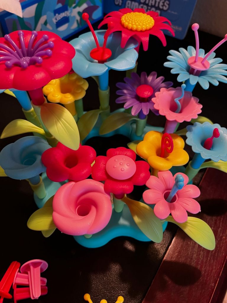 A little while ago, a friend of mine suggested a new activity for my mom. It was a flower garden kit. I found the kit in the toy section at Walmart and picked it up today. It consisted of a bucket full of plastic stems and leaves, flowers, and accessories, and base pieces. We sat at the table and put together a small circular base to start. I opened the package of leaves and stems and we filled in the holes in the base. We added more stems to some to make them taller. From there, we put the flowers on. Then, we added some accessories to the middle of the flowers to decorate them up a bit. The finished product was colorful and fun. It was such an engaging, joyful, beautiful activity. I was grateful that my friend thought of us and passed on the idea.