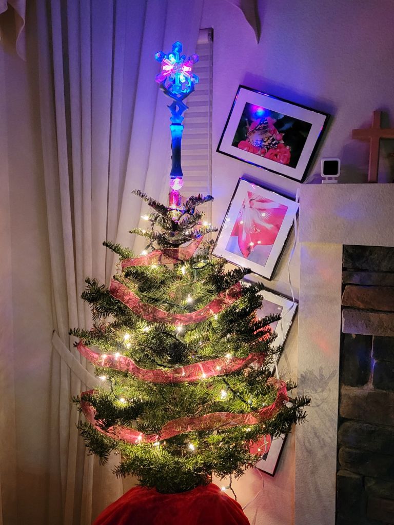 When I started thinking about decorating the house for Christmas, I knew I didn’t want to display the same artificial tree that I have put up for the past 10 years. My parents enjoyed it as it was pre-lit and rotated so you could admire all the decorations. I enjoyed it too for several years. But, as time went on, it got harder and harder to put together and the lights started going out. So, I knew I didn’t want to get it out again. At the same time, I didn’t really know what I wanted to do about a tree. Perhaps not get one at all since I knew I was going to be the only one in the house for Christmas. My sister had made plans to go visit her son and no one was going to come here for the holiday. I wasn’t sure I was even in a good frame of mind to do any decorating. Then, when my brother was here for Thanksgiving, we went to the racetrack to see the Christmas light display. As part of the entrance ticket, he bought me a fun light up wand. I knew right away that it needed to be a topper for a small Christmas tree. Today I bought a little table top tree that had a lovely long, sturdy top. My sister and I adorned it with lights, ribbon, and sparkly garland. Then I attached the light up wand. I added a couple of my favorite ornaments to finish it off. It was perfect. It was different. I cried. It was hard to be joyful and sad at the same time.