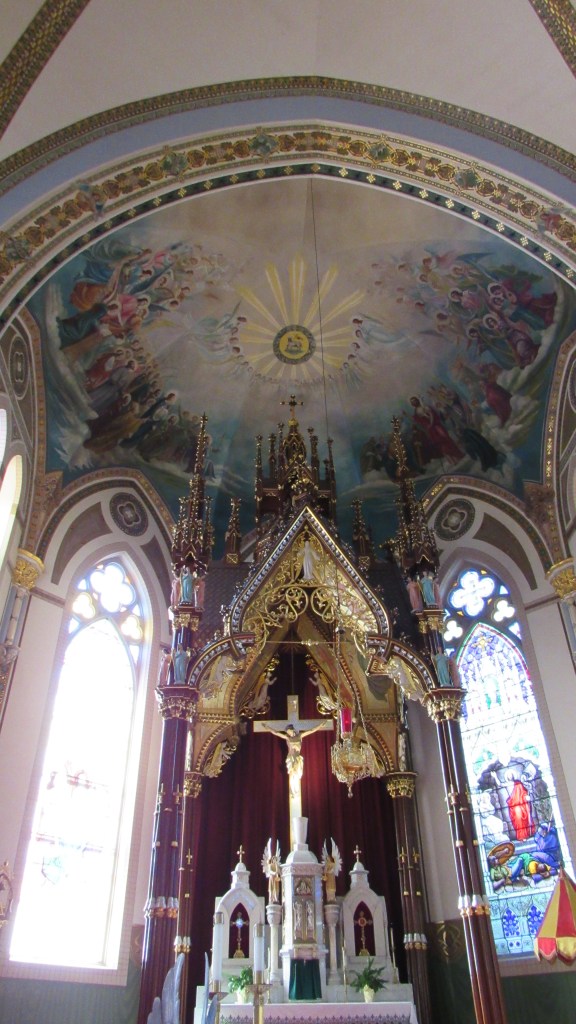 I love this photo of the altar in the Basilica of St. Francis Xavier. If you zoom in on the ceiling, you will see paintings of holy men and women, saints, and angels, worshipping the Lamb of God.