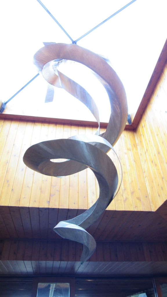 There is a water feature that begins with a large corkscrew type metal structure hanging from the ceiling. Water follows the corkscrew from the top to the bottom where it drips into a pool. This pool feeds a stream that flows from the visitor center outside to the walkway that connects to the chapel. The visible stream continues underneath the pews and collects in another small pool under the altar. Then it is recycled back to the visitors center to start all over. Walking around the outside you can hear the drone of vehicles on the highway. But inside the glass and wood chapel, there is only the peaceful sound of water trickling.