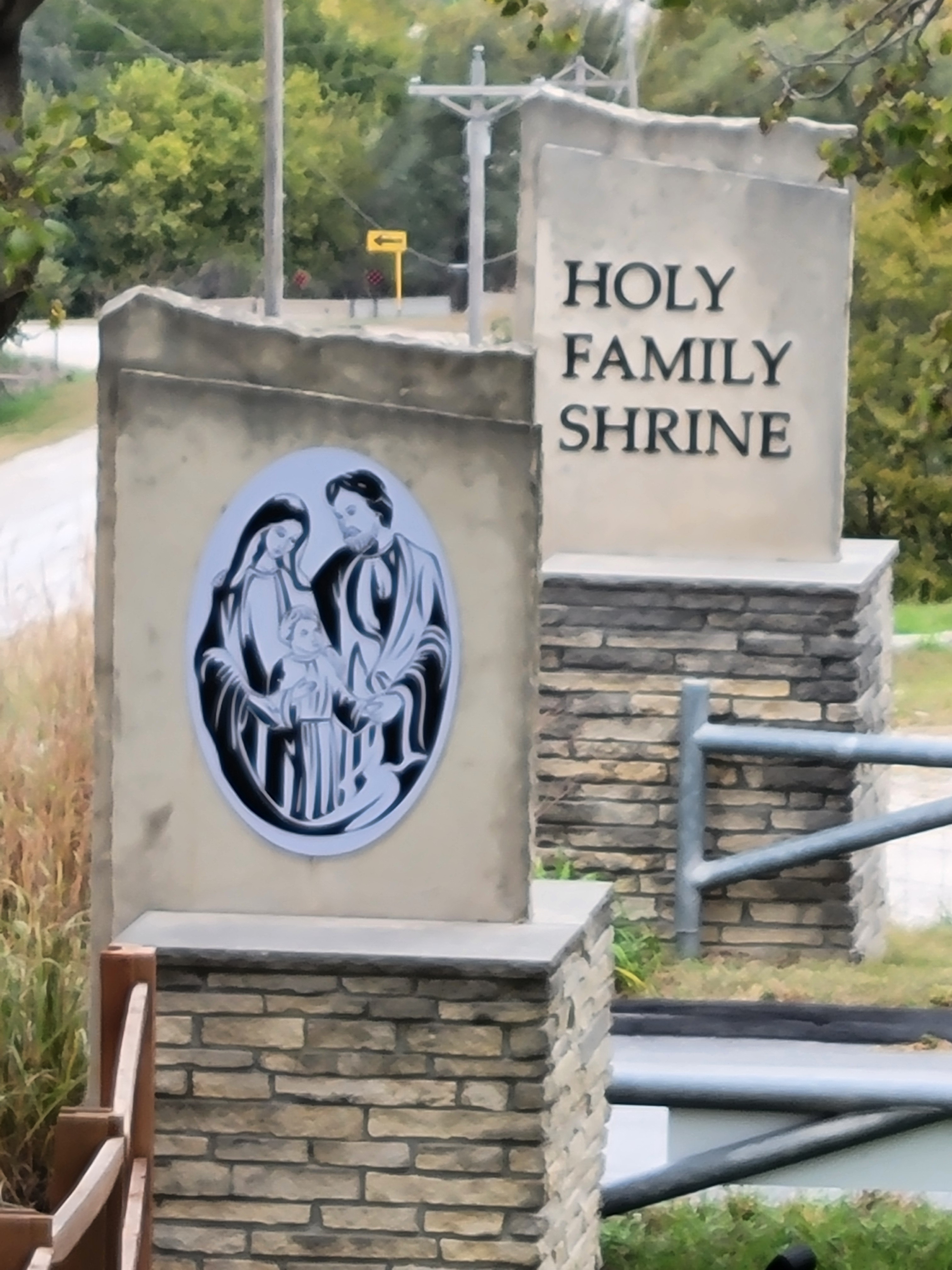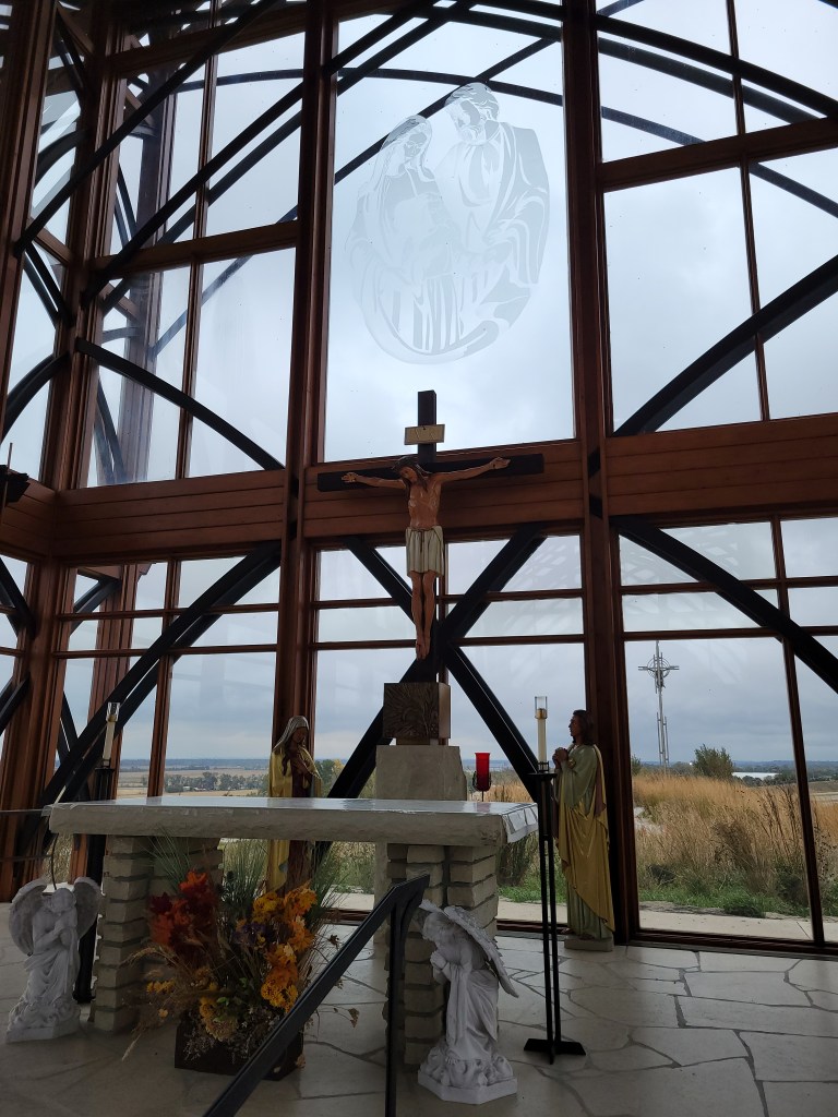 This first photo from the Holy Family Shrine shows a portrait of Joseph, Mary, and Jesus. The portrait is etched into the glass window behind the altar. Hopefully you can see it in the second photo.