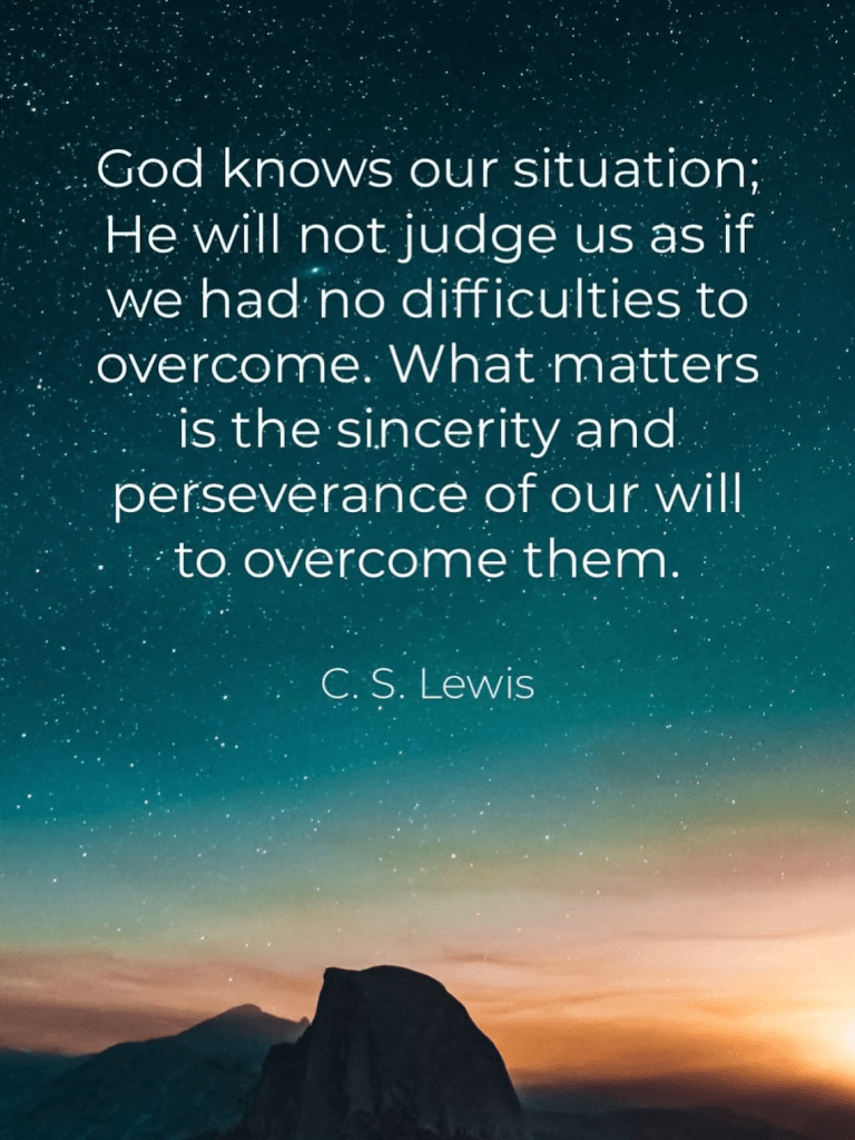 I was going through my photos today and found a quote by C.S. Lewis that I thought was very fitting as we start the New Year. Maybe we’re making resolutions or trying to overcome something we’re struggling with. For me, it is comforting to know that God knows all about our humanity in the person of Jesus Christ. And nothing we are going through surprises Him. I am grateful that He is still present, offering His love and comfort.
